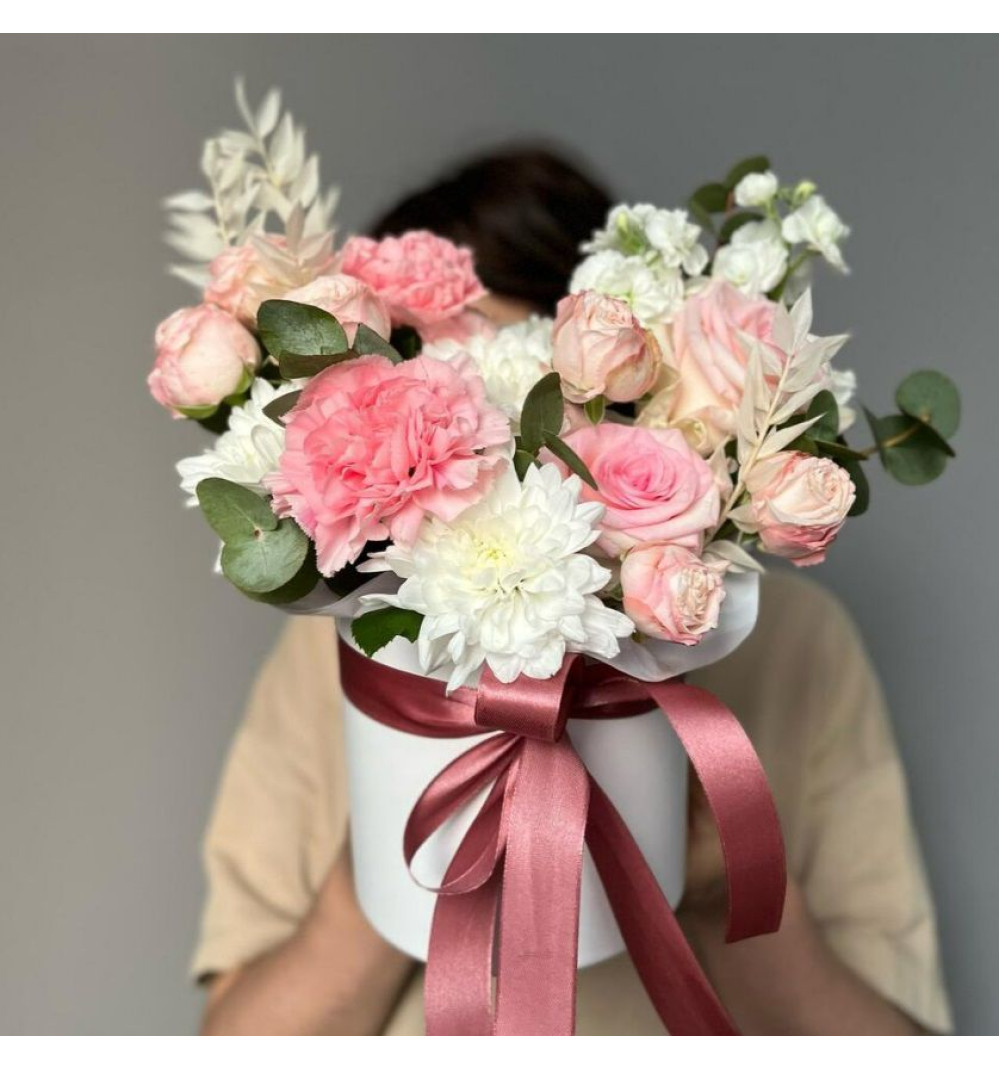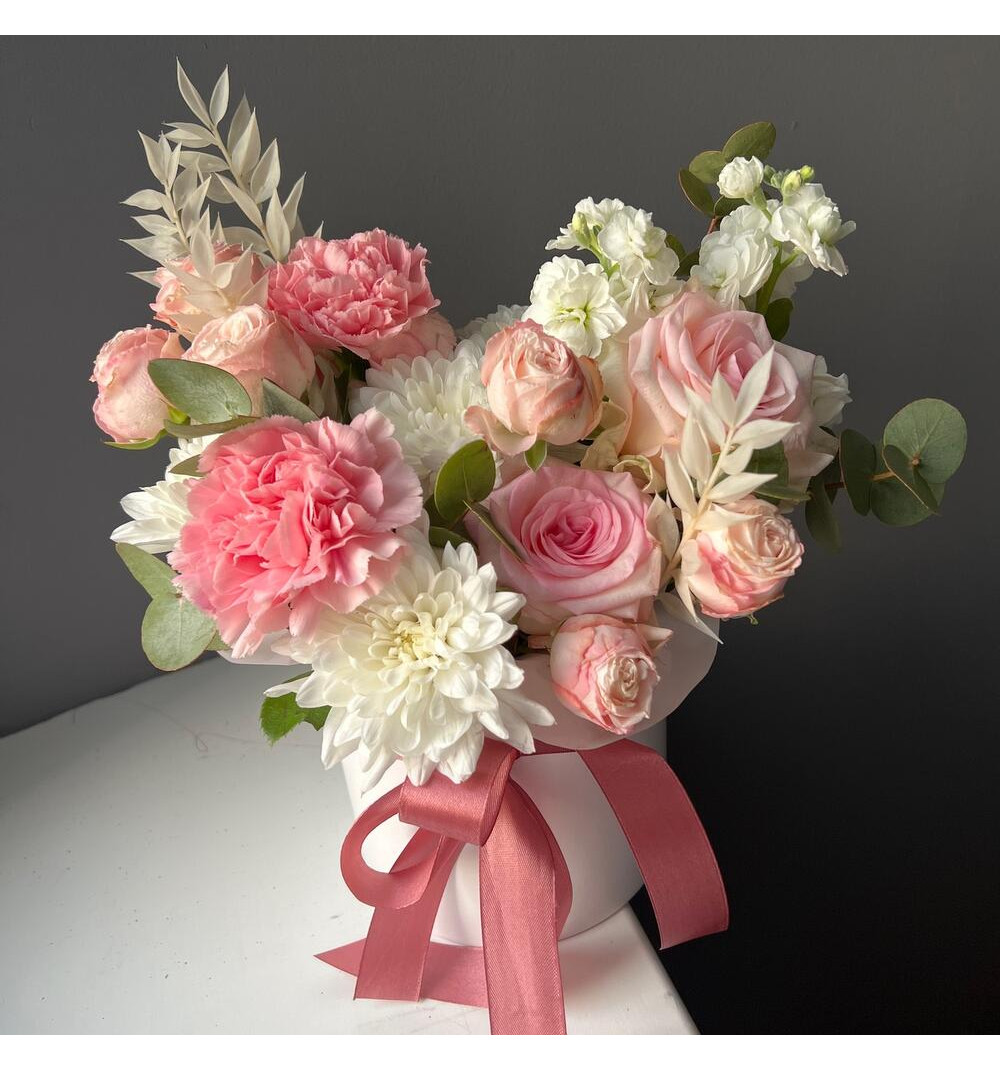 Купить Кустовые пионовидные розы, маттиола и хризантема в шляпной коробочке в Зыряновске за 15 000 ₸ | интернет-магазин «Guls»